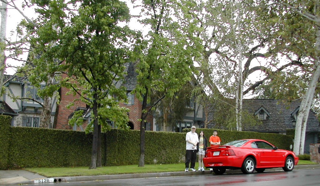 Our rental Mustang in the Courtyard next to the Woodshop/Garage on April 17, 2003 at Chris's house in North LA. |